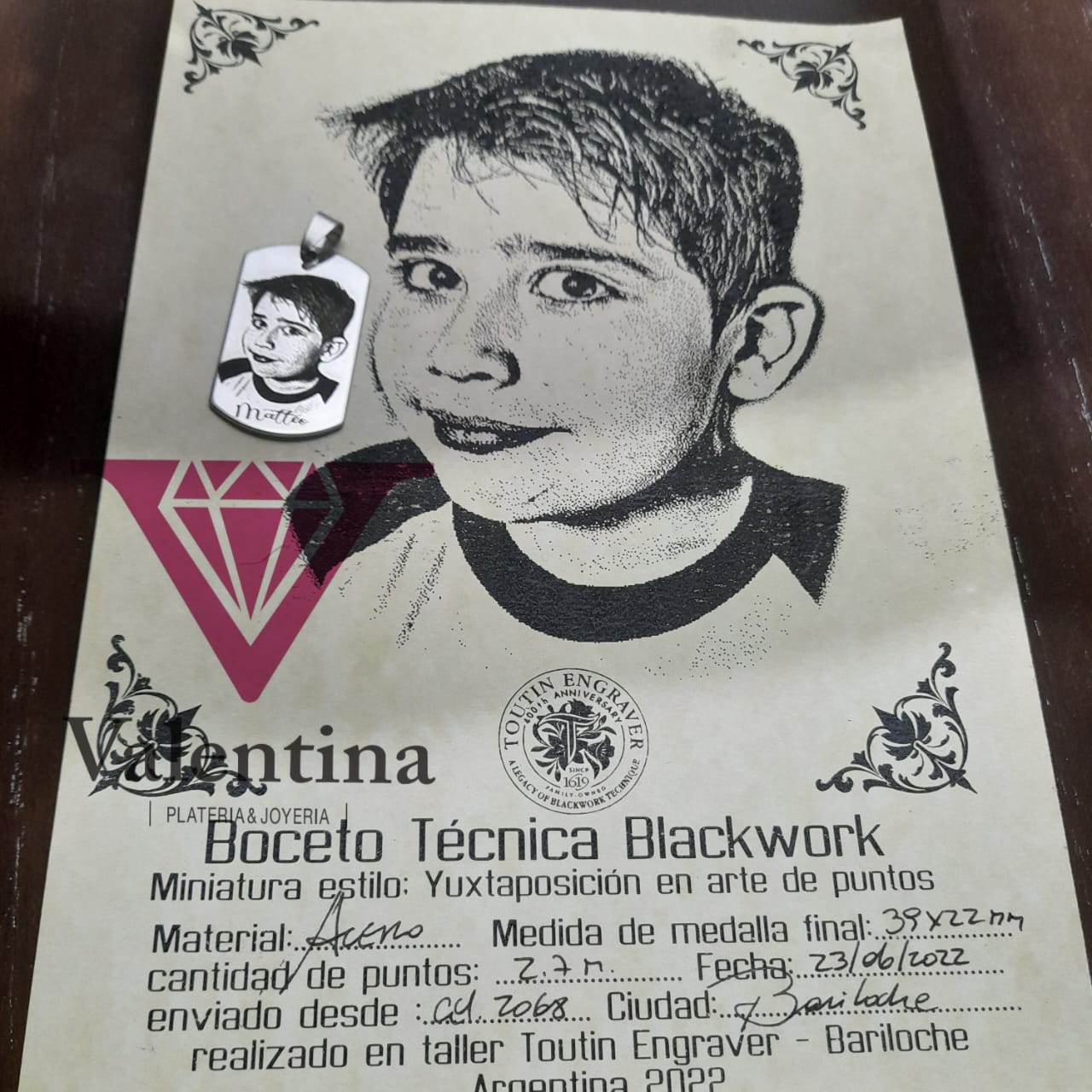 Medalla con fotografía frente y frase atrás sin costo (o fecha de calendario), cadenita de 45cms , (o accesorio de acero para llavero), boceto final impreso de recuerdo, estuche y bolsita todo listo para regalar.